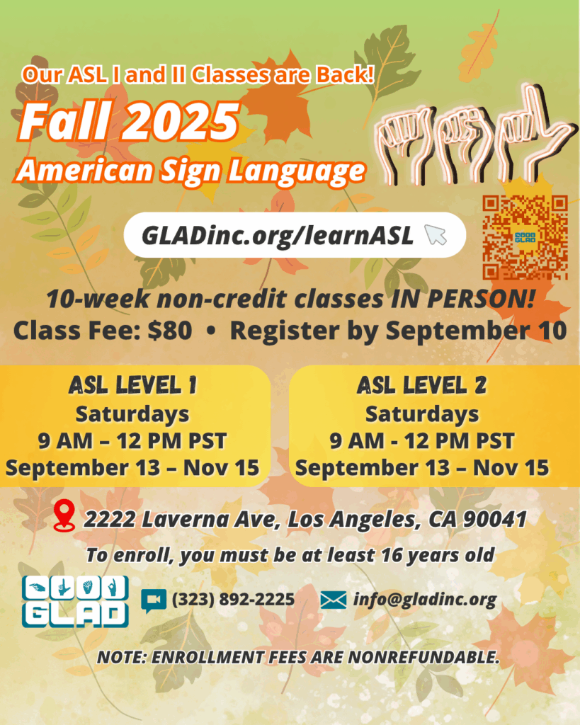 ID: Green and orange gradient background with faded green gradient color into white dots and multiple color leaves falling. From top to bottom is white text with black outline: “Our ASL 1 and 2 Classes are Back!” and then “Fall 2025 American Sign Language.” On the right side is the fingerspelling of the ASL alphabet in neon orange colors. At the center is a large search bar with a link: ” GLADinc.org/LearnASL“, black text: “10- week non-credit class IN PERSON!”, “Class Fee: $80” and “Register by September 10.” Below is the yellow and orange gradient text: “ASL Level 1 & 2: Saturdays, 9:00 AM – 12:00 PM PST, September 13 through November 15.” Red drop pin is next to the black text: ” 2222 Laverna Ave, Los Angeles, CA 90041.” On the bottom left side is the GLAD logo, teal videophone icon with black text: “(323) 892-2225 ” and teal email icon with black text: “info@gladinc.org.”