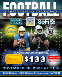 ๐ GLAD is thrilled to invite the deaf* and signing communities to enjoy the NFL game once again for the second time! Watch the exciting game between the Los Angeles Chargers vs the Las Vegas Raiders on November 30 at 1:25 pm! ๐