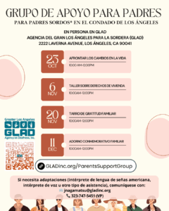 Actualizaci贸n de GLAD Salud Mental sobre el Grupo de Apoyo para Padres con discapacidad auditiva en el Condado de Los 脕ngeles, solo presencial en GLAD.